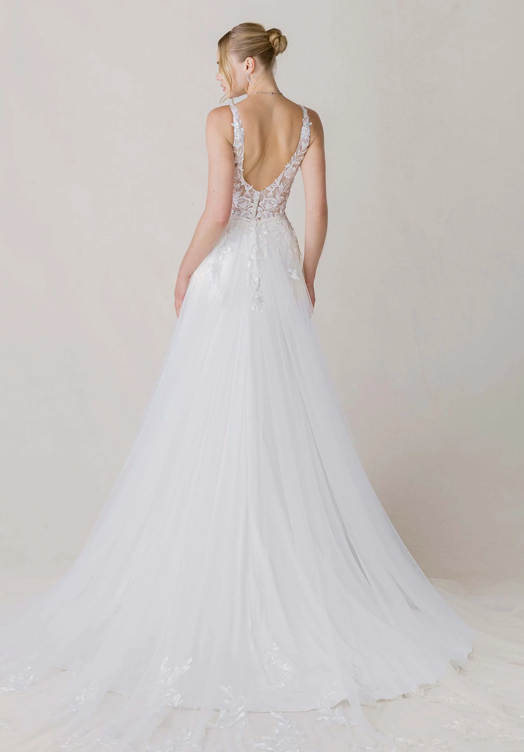 Fit and flare wedding dress has a plunging V-neckline on a crystal beaded floral bodice with a crepe skirt and detachable tulle overskirt.