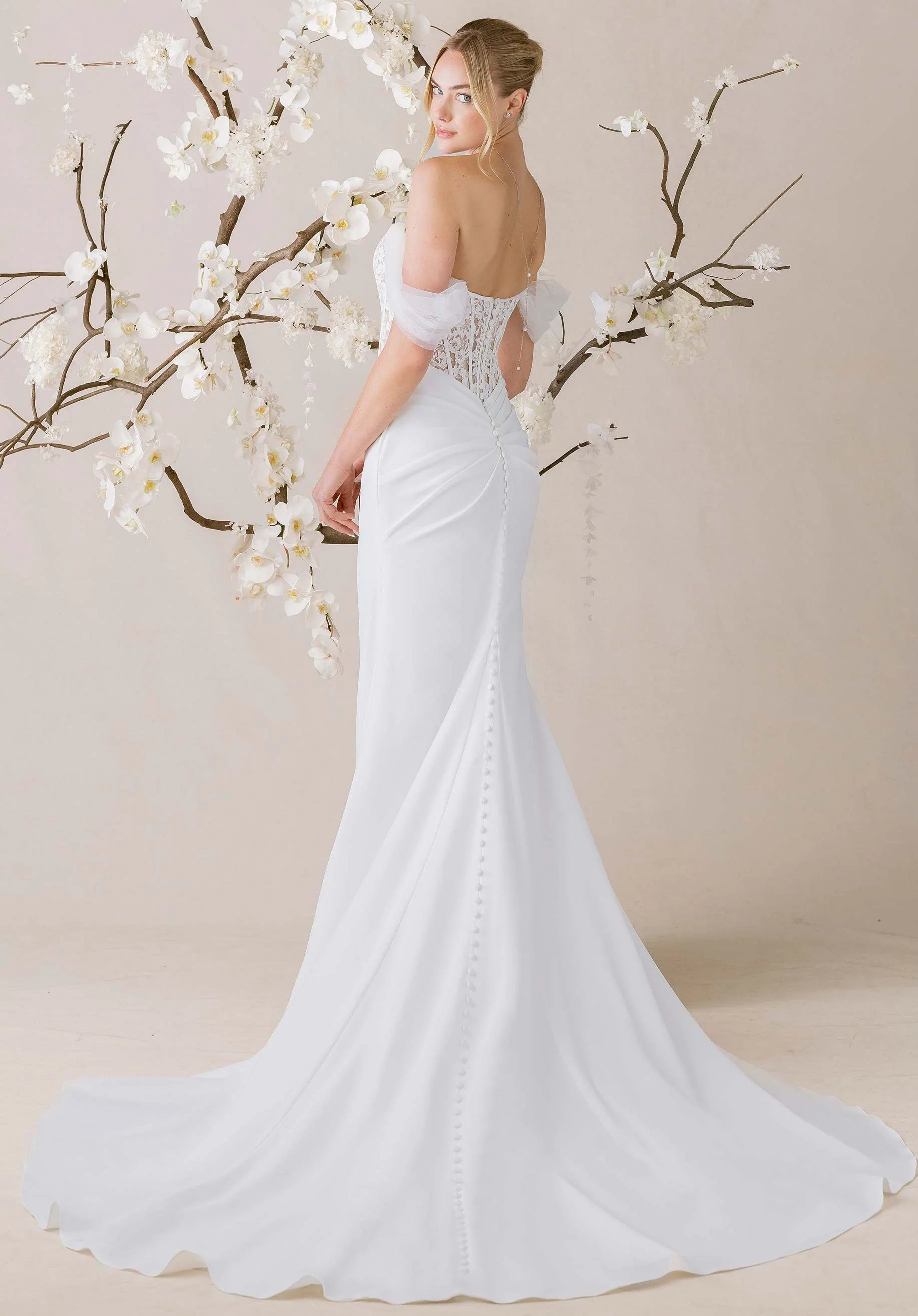 Fit and flare wedding dress has a sheer, lace embroidered bodice with a plunging strapless sweetheart neckline and corset boning on a wrap-style crepe skirt and detachable tulle off-the-shoulder sleeves.