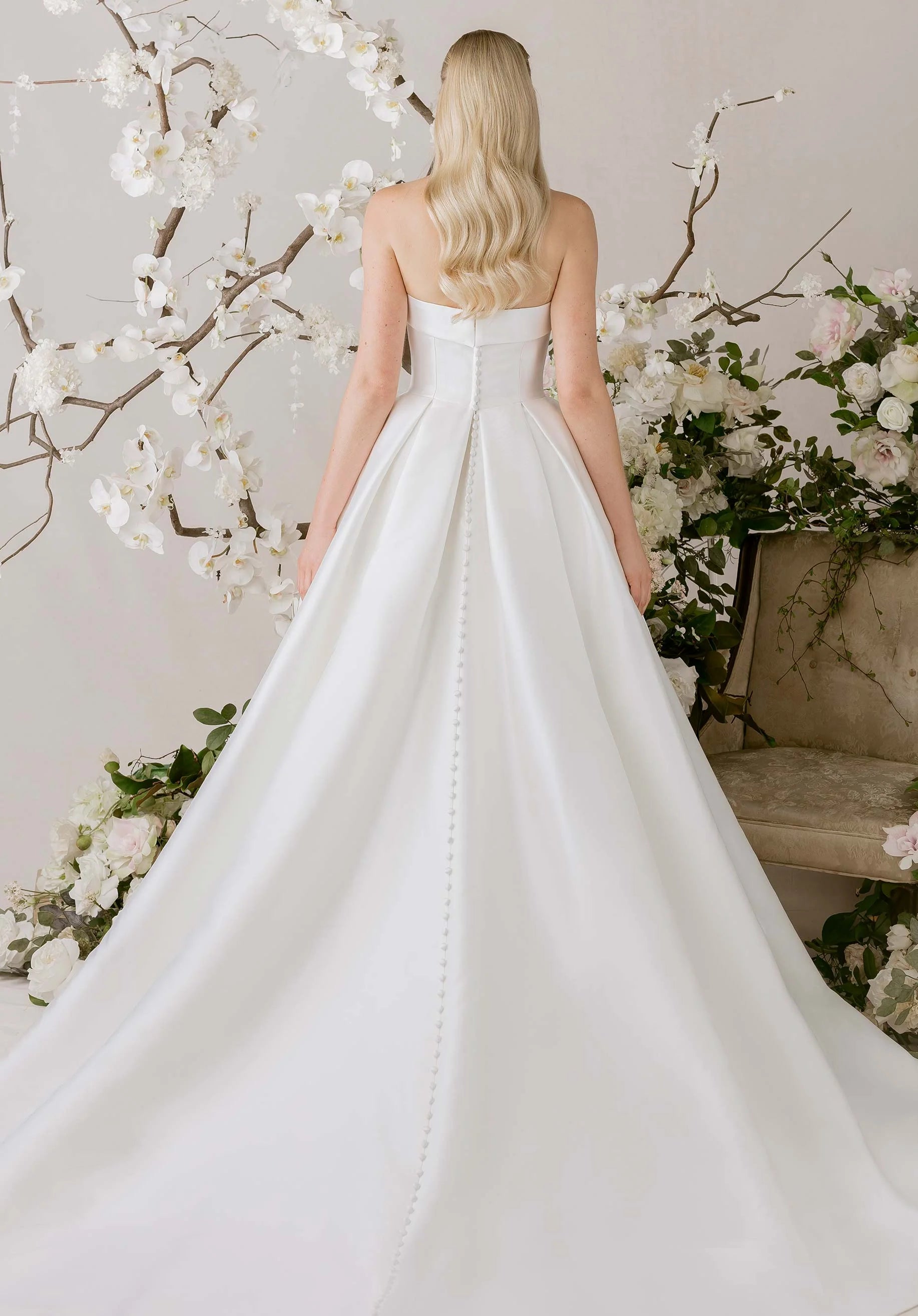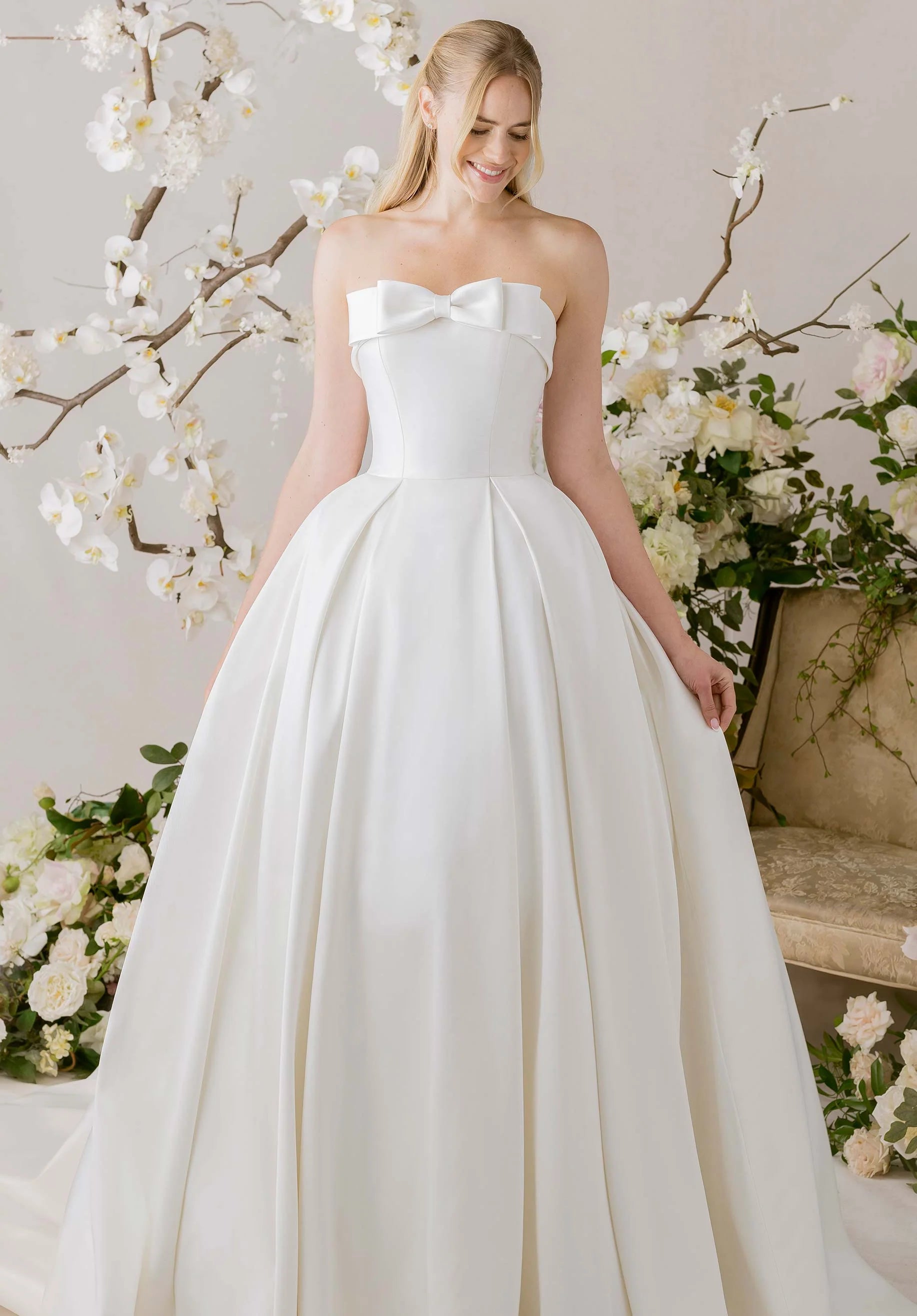 Ball gown wedding dress has a strapless straight neckline with detachable fold-over bow detail on a box pleated skirt with buttons down to the chapel-length train in Mikado.