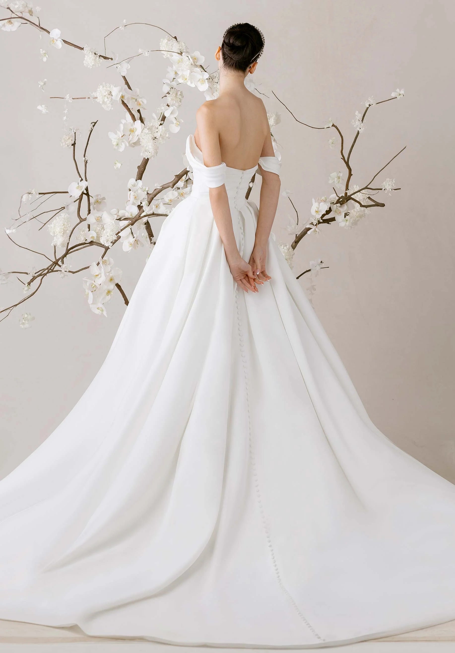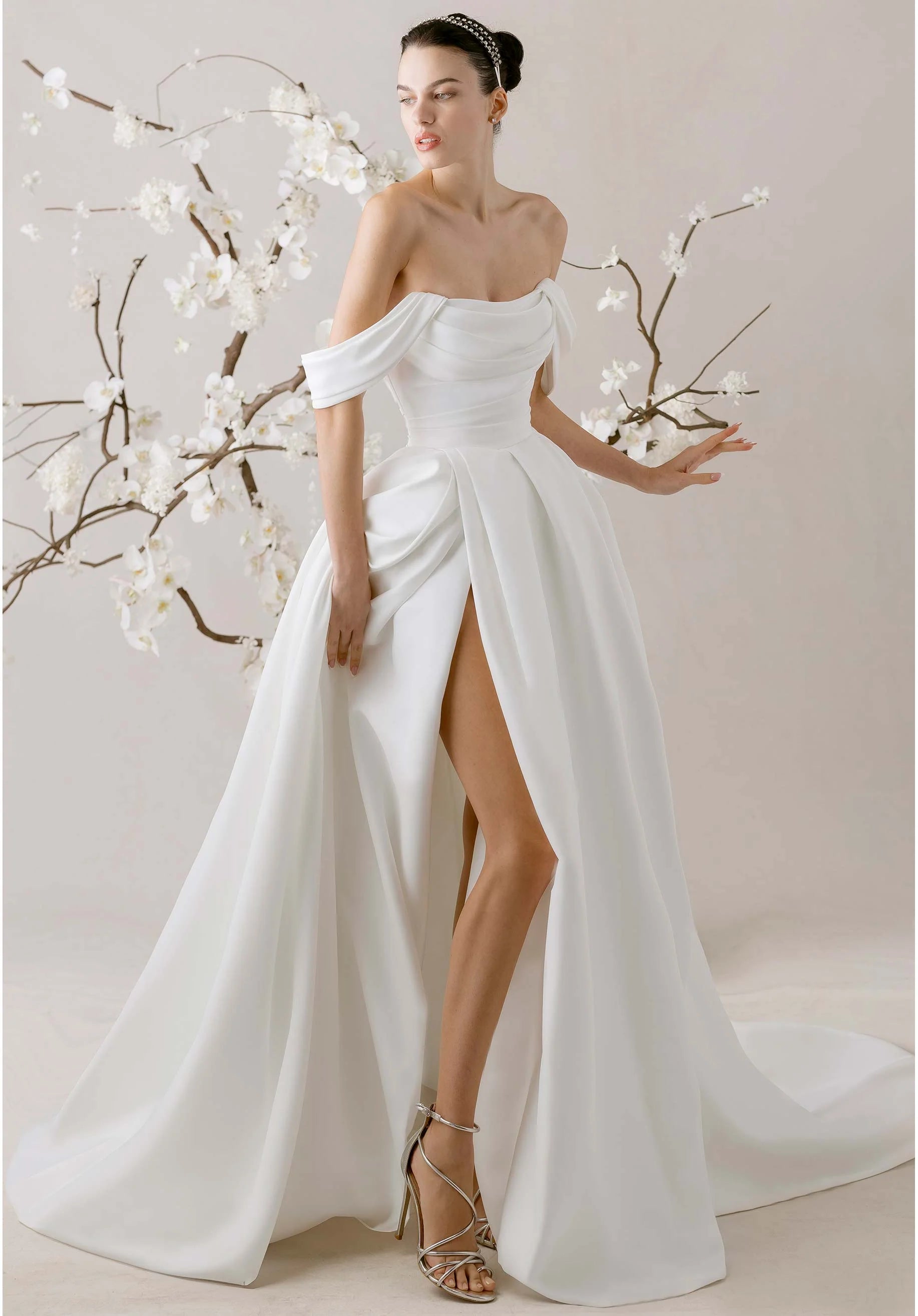 Satin A-line wedding dress has a strapless neckline on a draped bodice with detachable off-the-shoulder sleeves on a softly pleated skirt with a slit.