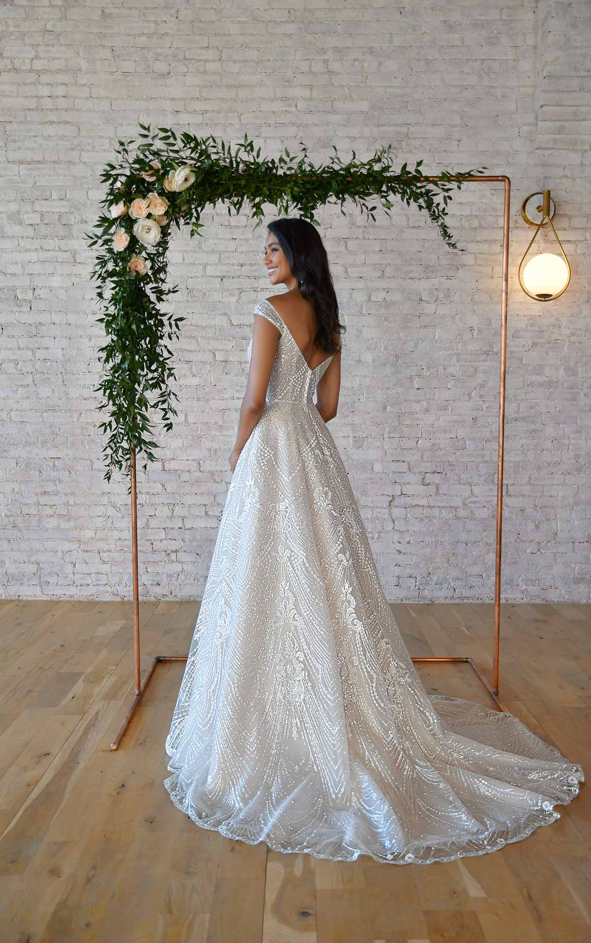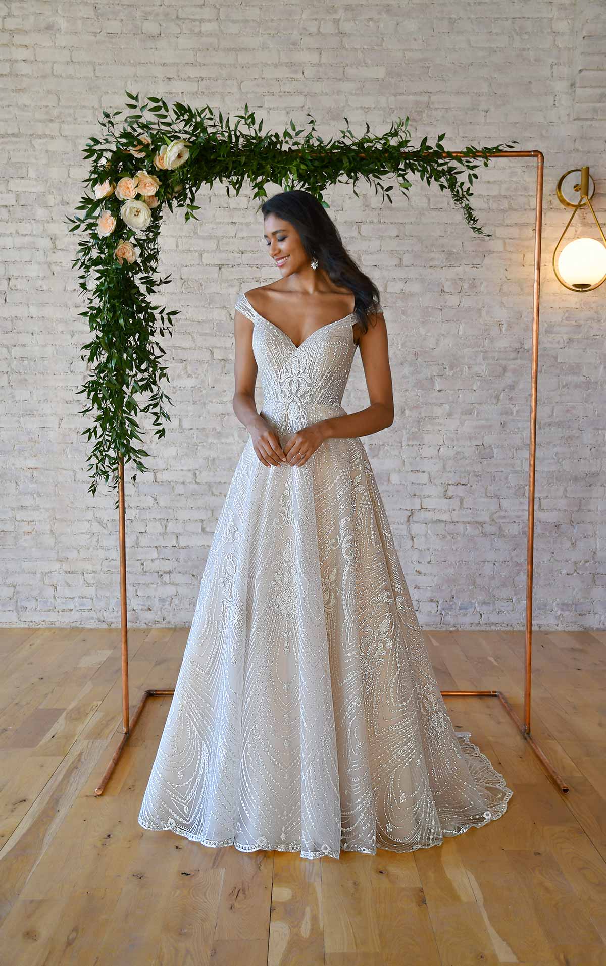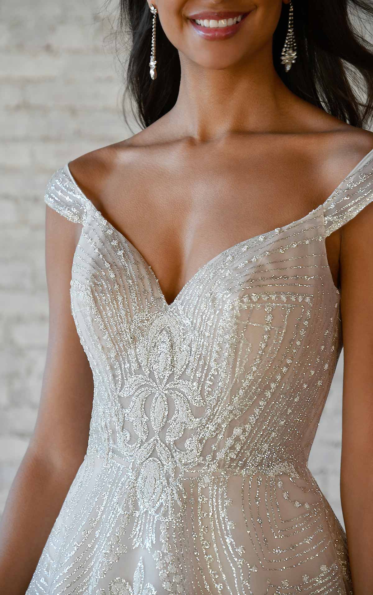 The party has arrived! Style 7336 has all the sparkle and embellishments for a true celebration of love. Fit for a queen, this wedding gown has an effortless formality with a modern twist. Embossed glimmer tulle with an inventive linear design throughout pairs with silver and ivory sparkle details on the bold swirling patterns for a dazzling effect. The off-the-shoulder strap and A-line skirt create a timeless feel, with a corset-style bodice providing unmatched structure. Layers of tulle and organza come together to form a subtly voluminous skirt, ready to dance the night away.