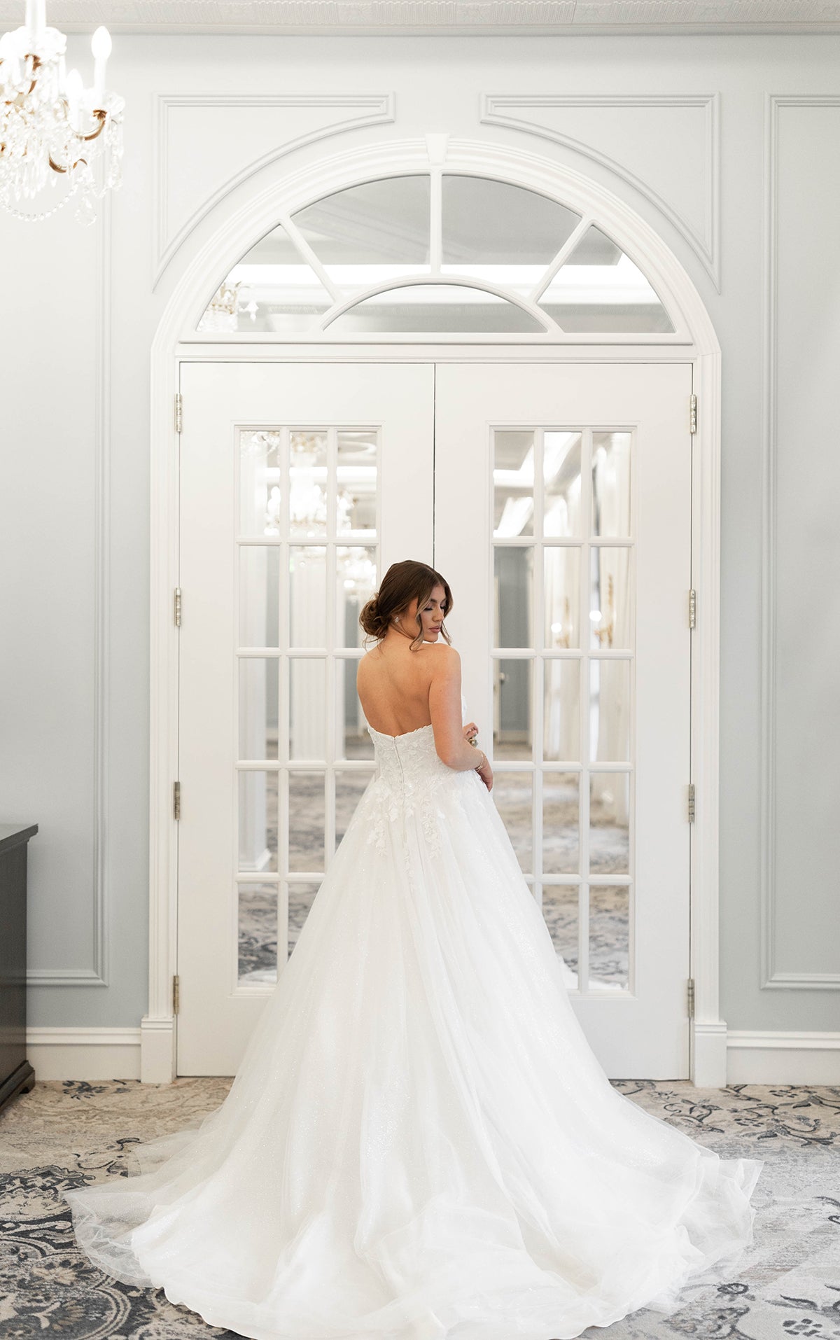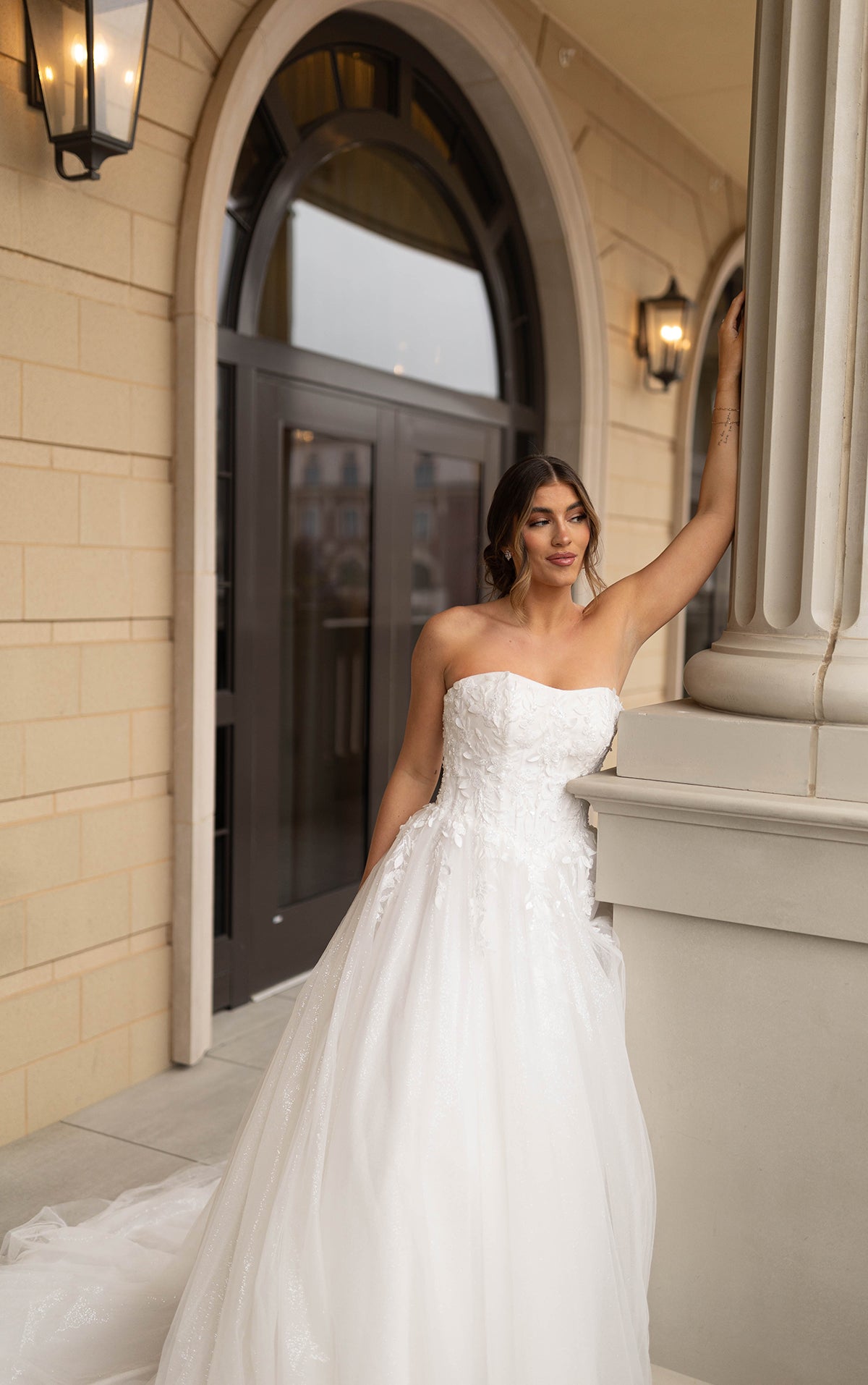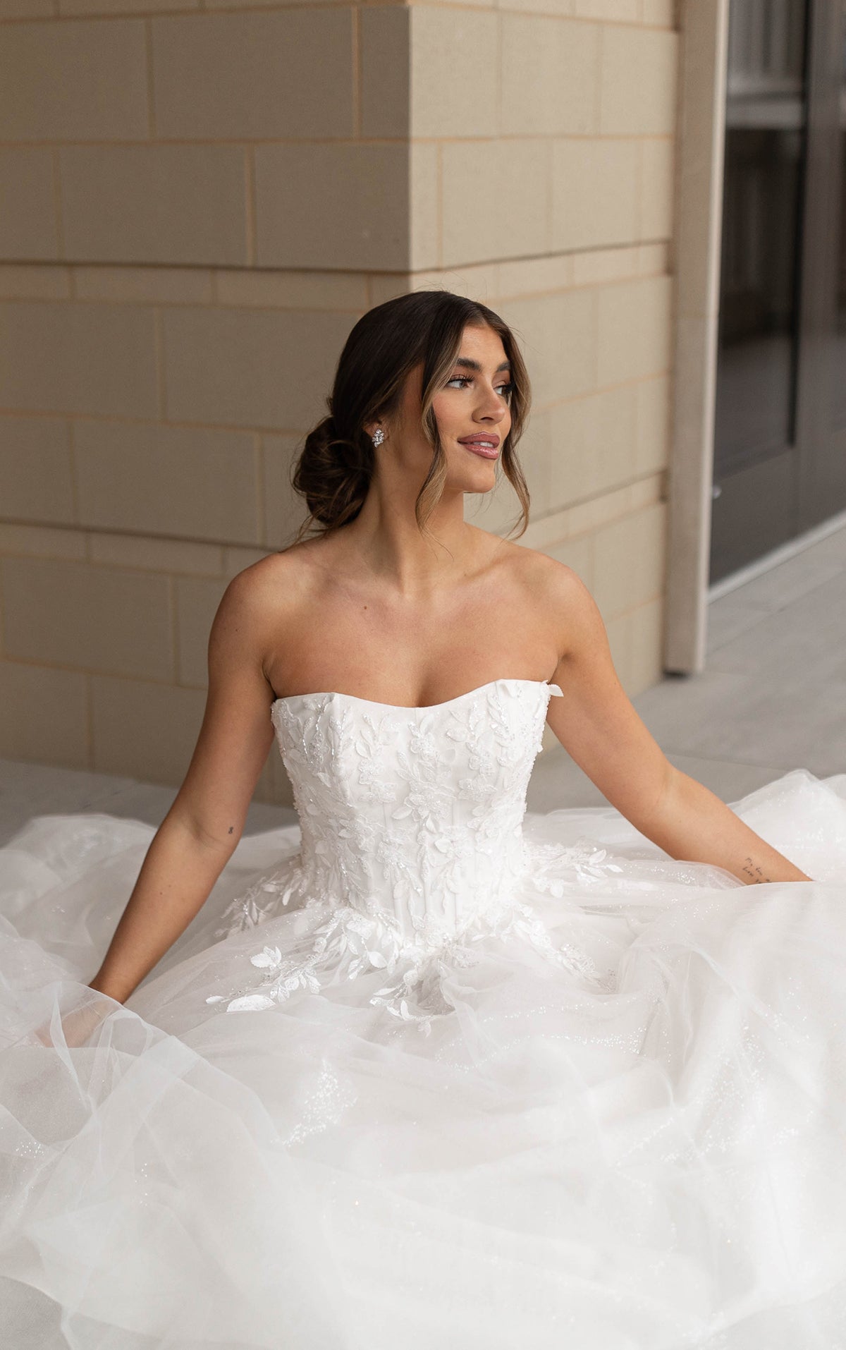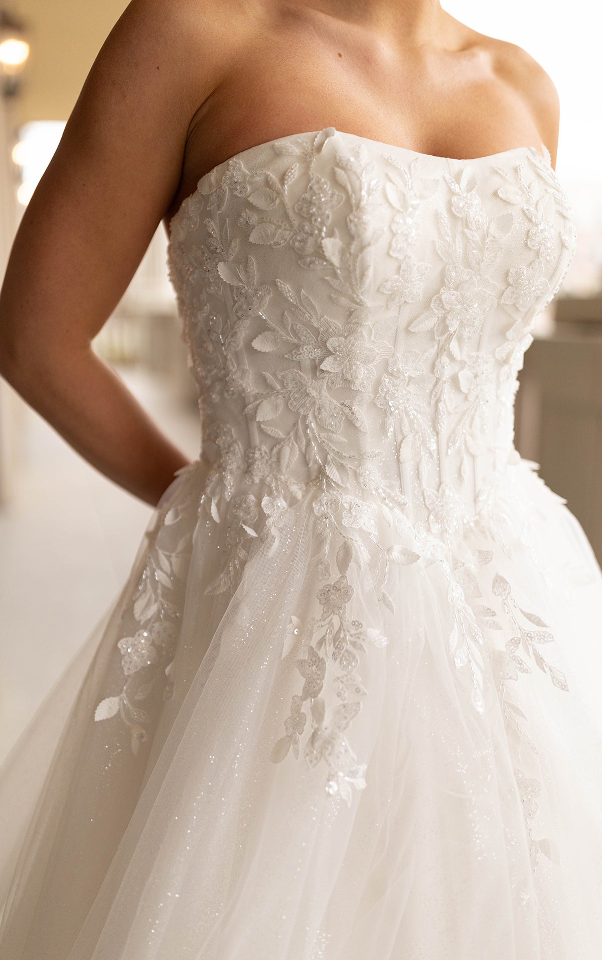 An enchanting strapless wedding gown, Style 7974 pairs dazzling glitter tulle with romantic florals atop a stunning ballgown silhouette. From a scooped strapless neckline, the impeccably tailored bodice flourishes with intricate embellished lace and delicate 3D floral accents. Cascading past the waistline, floral tendrils dissipate into a sea of sparkling layers of glitter tulle, forming a dramatic princess ballgown skirt. Both ethereal and sophisticated, this strapless glitter wedding dress is an absolute showstopper. This wedding gown is available lined or unlined and is also available in plus sizes.