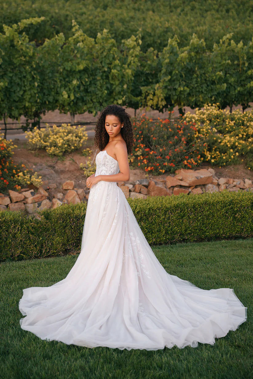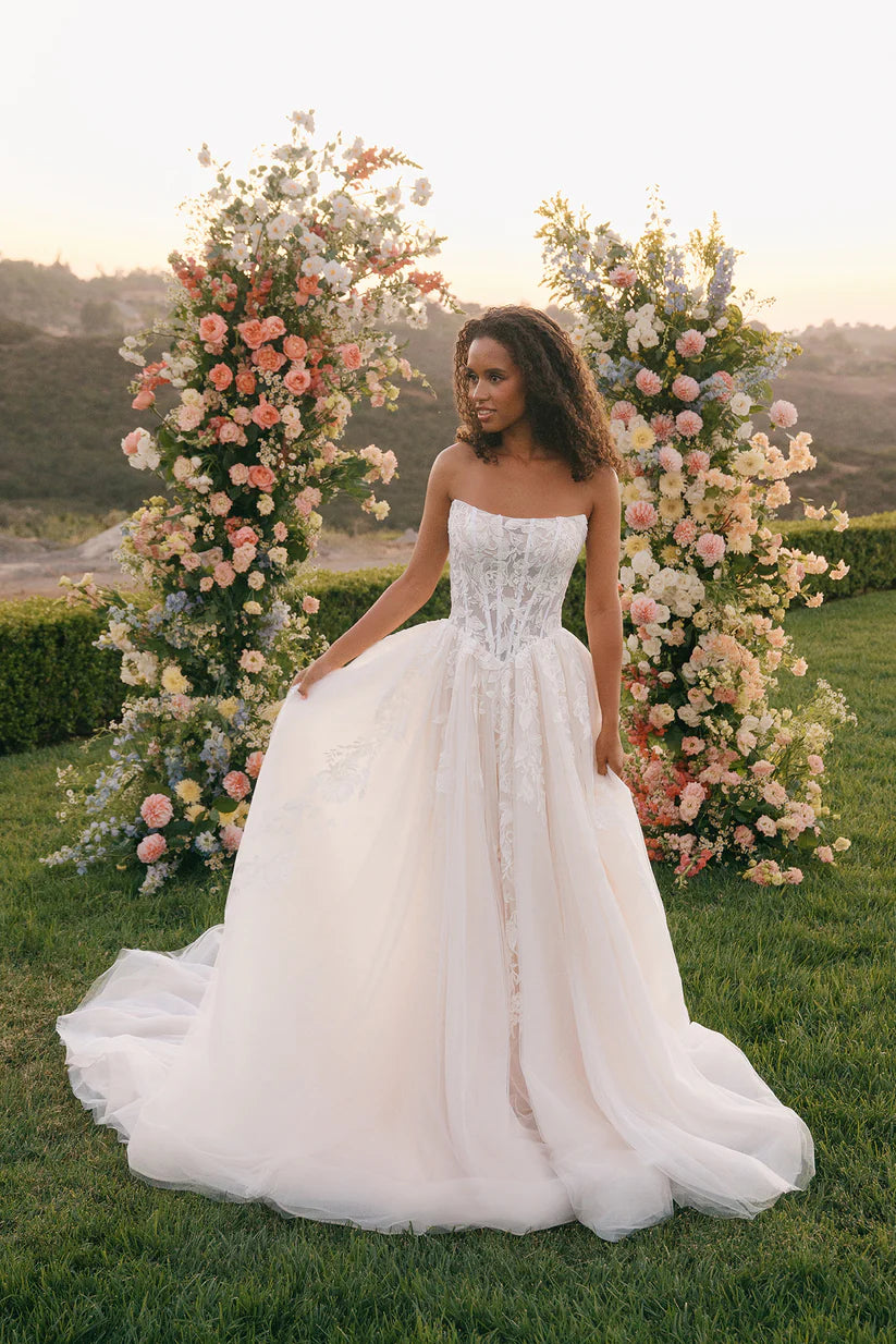 Shimmering sequin lace appliques cascade over layers of soft tulle in this romantic ballgown. The strapless subtle cat-eye neckline frames an exposed-boning, corseted bodice that sculpts and defines the basque waist before flowing into a full, airy skirt. Crafted in lace and tulle with a subtle basque waist, the gown blends ethereal texture with modern structure. A coordinating lace jacket, sold separately as A1408J, adds optional coverage and an extra touch of romance.