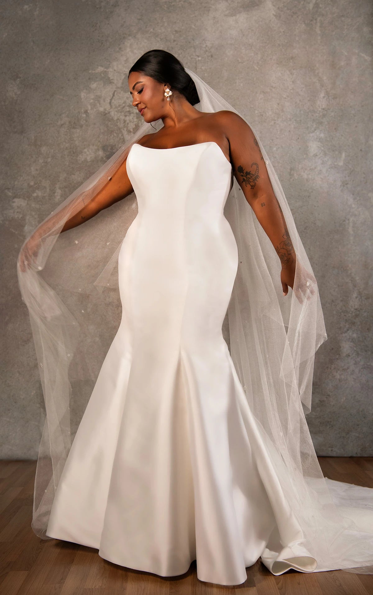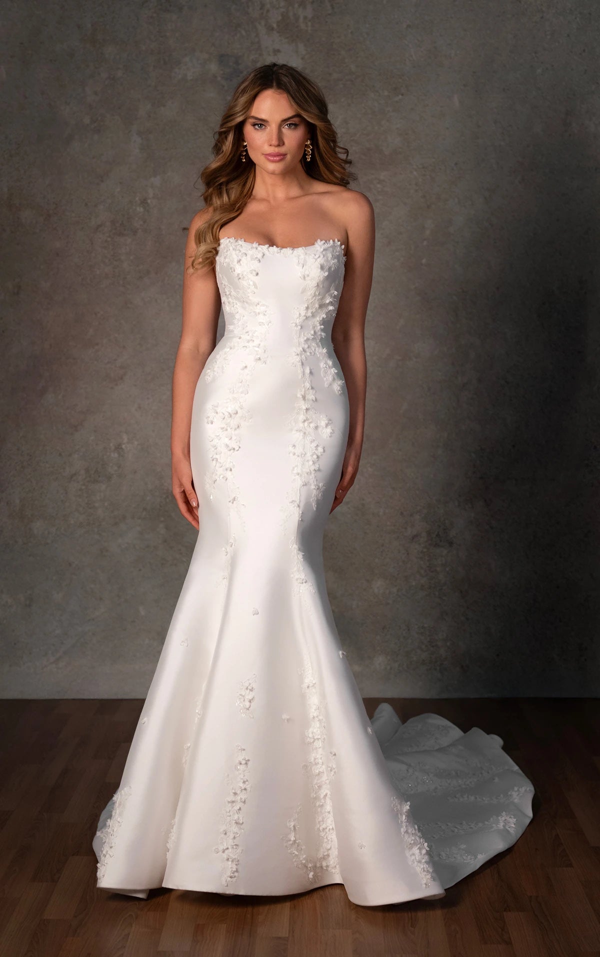 Style D4257 blends modern simplicity with a structured design. Made from Mikado fabric, this fit-and-flare wedding dress features a modern strapless cat eye neckline. Fitted bodice is shaped with 3D lace appliqués that trail elegantly down the skirt. A sleek skirt flares from the knee, creating a classic silhouette that moves with ease.