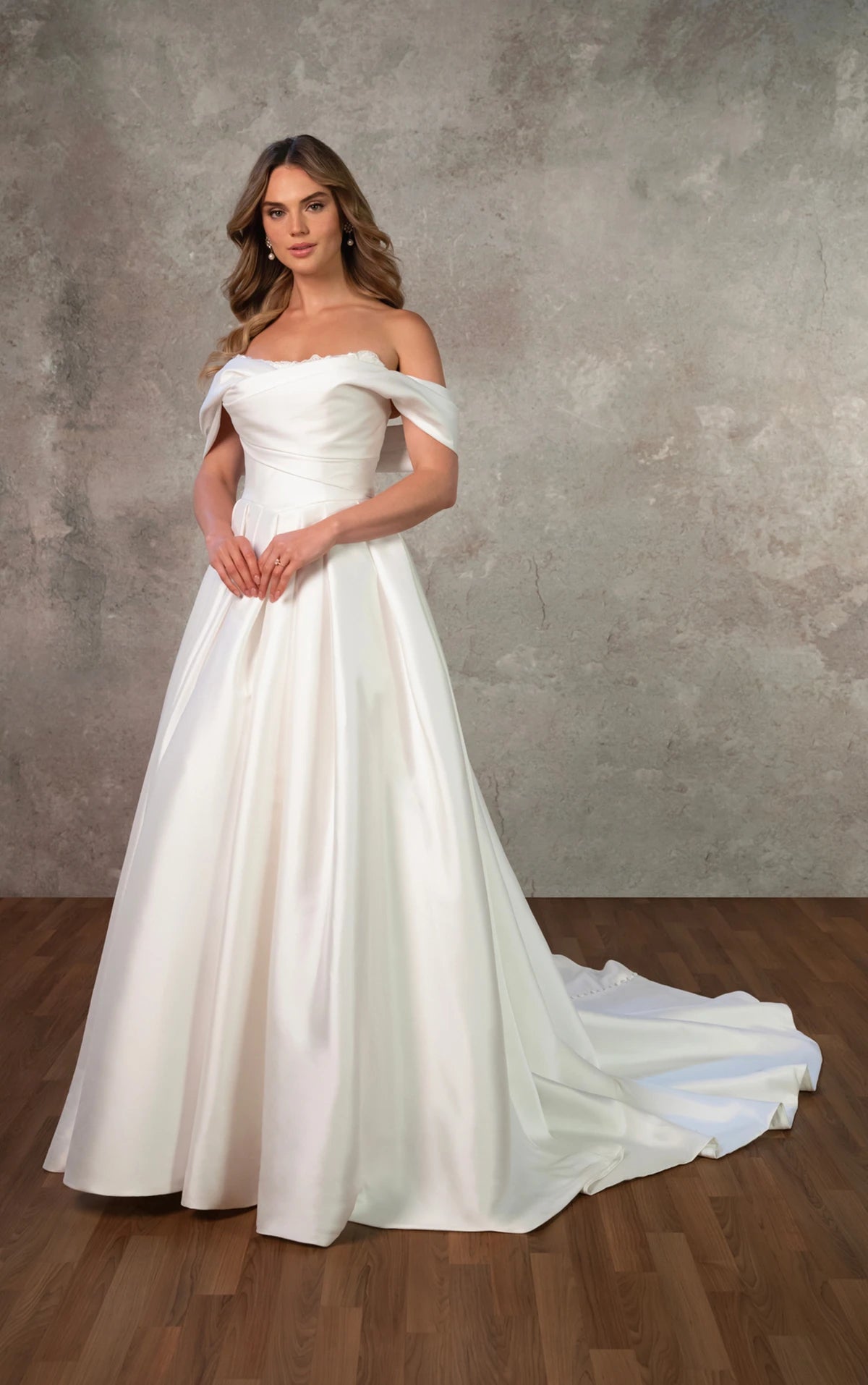 Romantic, refined, and effortlessly timeless — this off-the-shoulder satin wedding dress is designed for the bride who wants to feel like royalty on her big day. The elegant draped neckline softly frames the shoulders, while the fitted bodice highlights the waist before flowing into a graceful A-line skirt. Crafted from luxe satin, this gown offers a radiant sheen that photographs beautifully from every angle. The structured pleats in the skirt add depth and movement, while the chapel-length train creates a dramatic and unforgettable finish as you walk down the aisle.