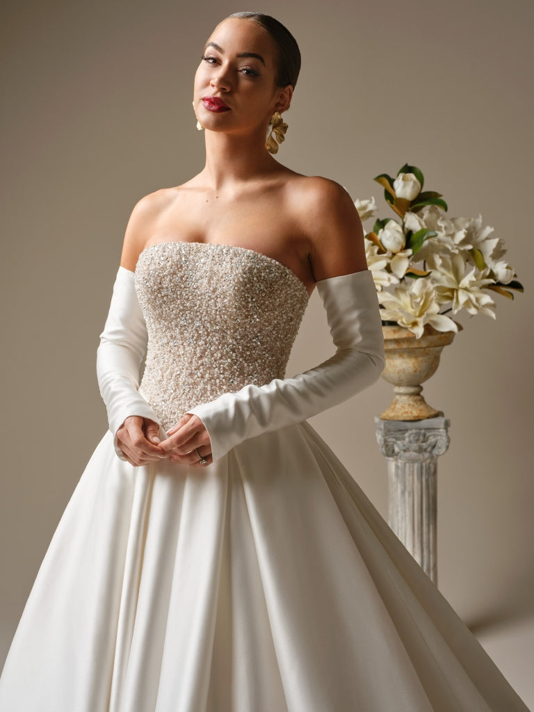Make a statement in the Sottero and Midgley Dmara wedding dress, a breathtaking strapless ball gown designed for the modern bride who loves timeless luxury. The sparkling beaded bodice shimmers with intricate embellishments, while the full satin skirt creates a dramatic, fairytale-worthy silhouette. Perfect for brides who want elegance, glamour, and a touch of royal sophistication, this designer gown combines classic romance with couture details.