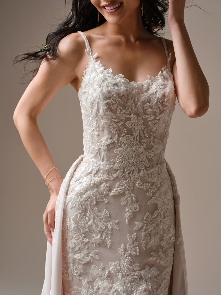 Featuring: Scoop neckline, Spaghetti beaded straps, Additional detachable over skirt, Lace, Mermaid/Fit&Flare, Floral, Beading, Glitter, Boning, Corset, Glitter.
