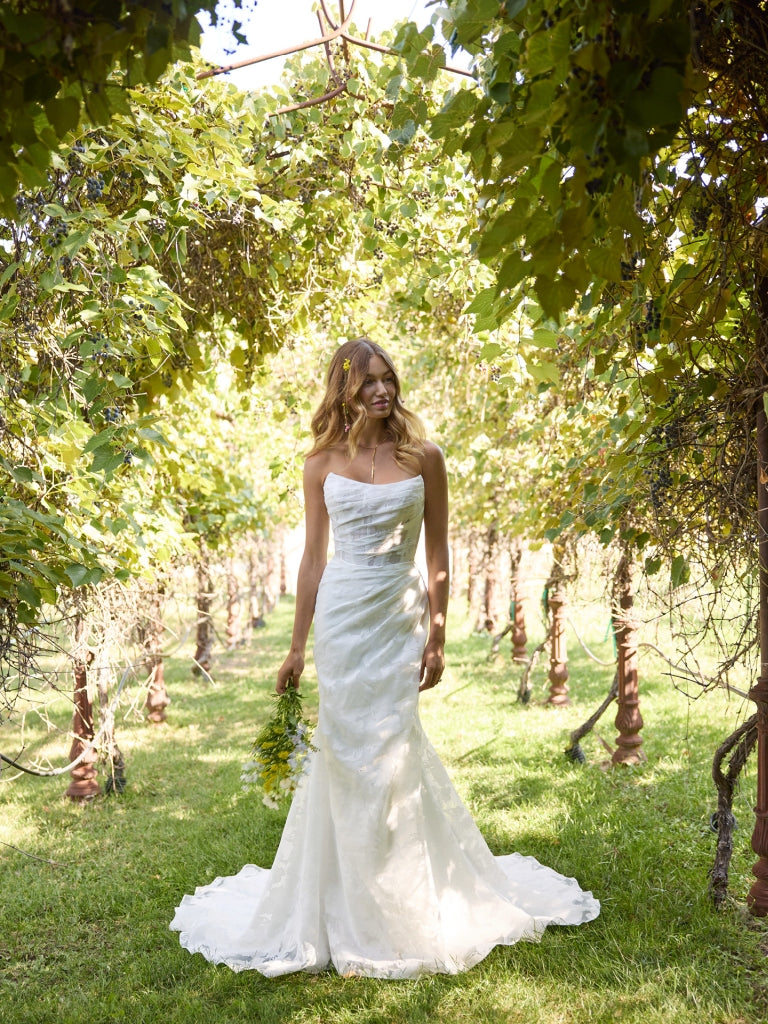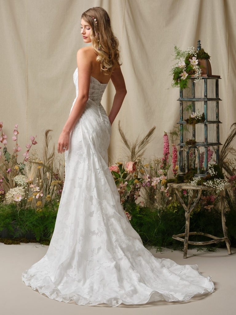 Kendall's elegant printed organza cat eye neckline sheath wedding dress.