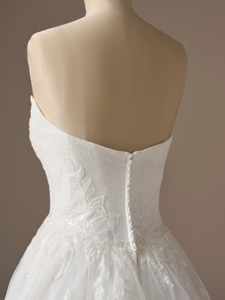 Featuring: Strapless scoop neckline, Cat eye, Basque waist, Boning/Corset, Tulle, Chantilly lace, Floral/Leafy Lace, Sparkles.