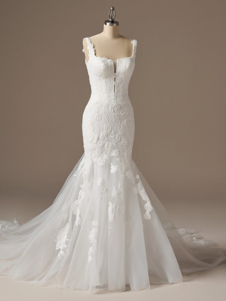 Featuring: Square neckline, Illusion plunge neckline, Scoop back, Floral lace, Tulle, Mermaid, Thick straps.