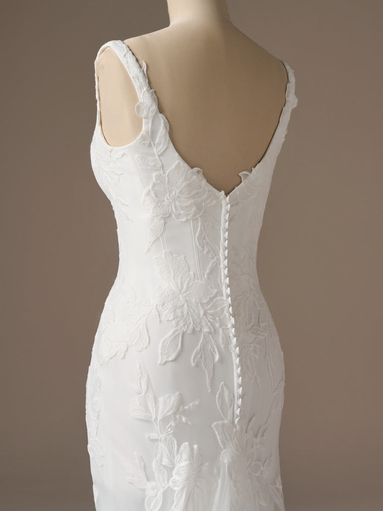 Pearline delicate plunging square neckline illusion bodice fit-and-flare wedding dress.