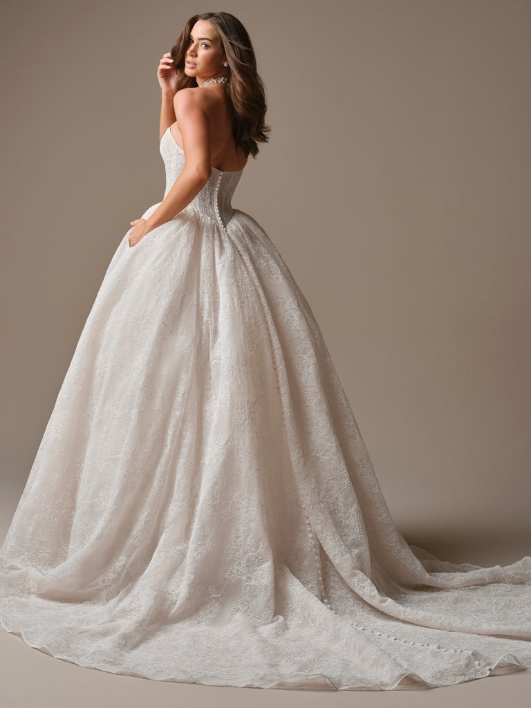 Turn every head with this regal ballgown wedding dress. The Raquel gown features a romantic off-the-shoulder neckline with delicate draped straps, a structured bodice with modern corsetry detail, and a full lace-embroidered skirt that glides with fairytale drama. Designed for the bride who loves timeless elegance with a hint of modern allure, this gown perfectly balances sophistication and romance.