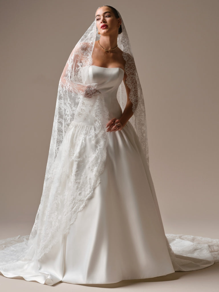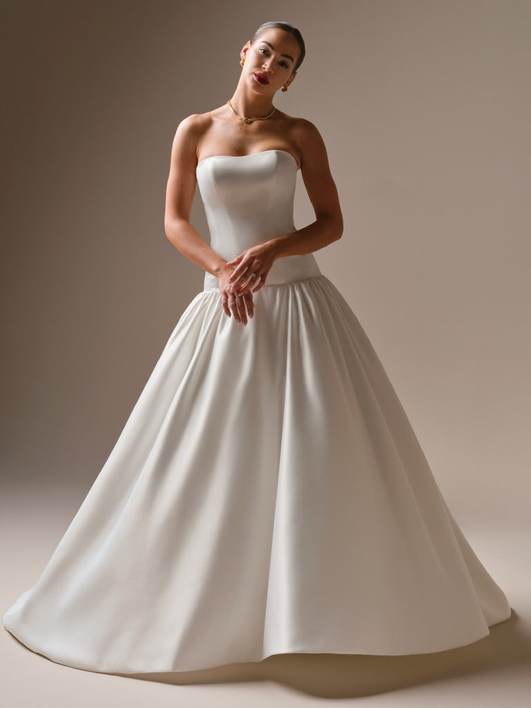 When lower-impact materials meet minimalist couture (Gorgeous accessories), the result is this strapless satin ballgown wedding dress with dropped waist, lace-up corset, and scoop neckline, and (therefore) the most effortless fusion of style, substance, and glamour for your perfect day.